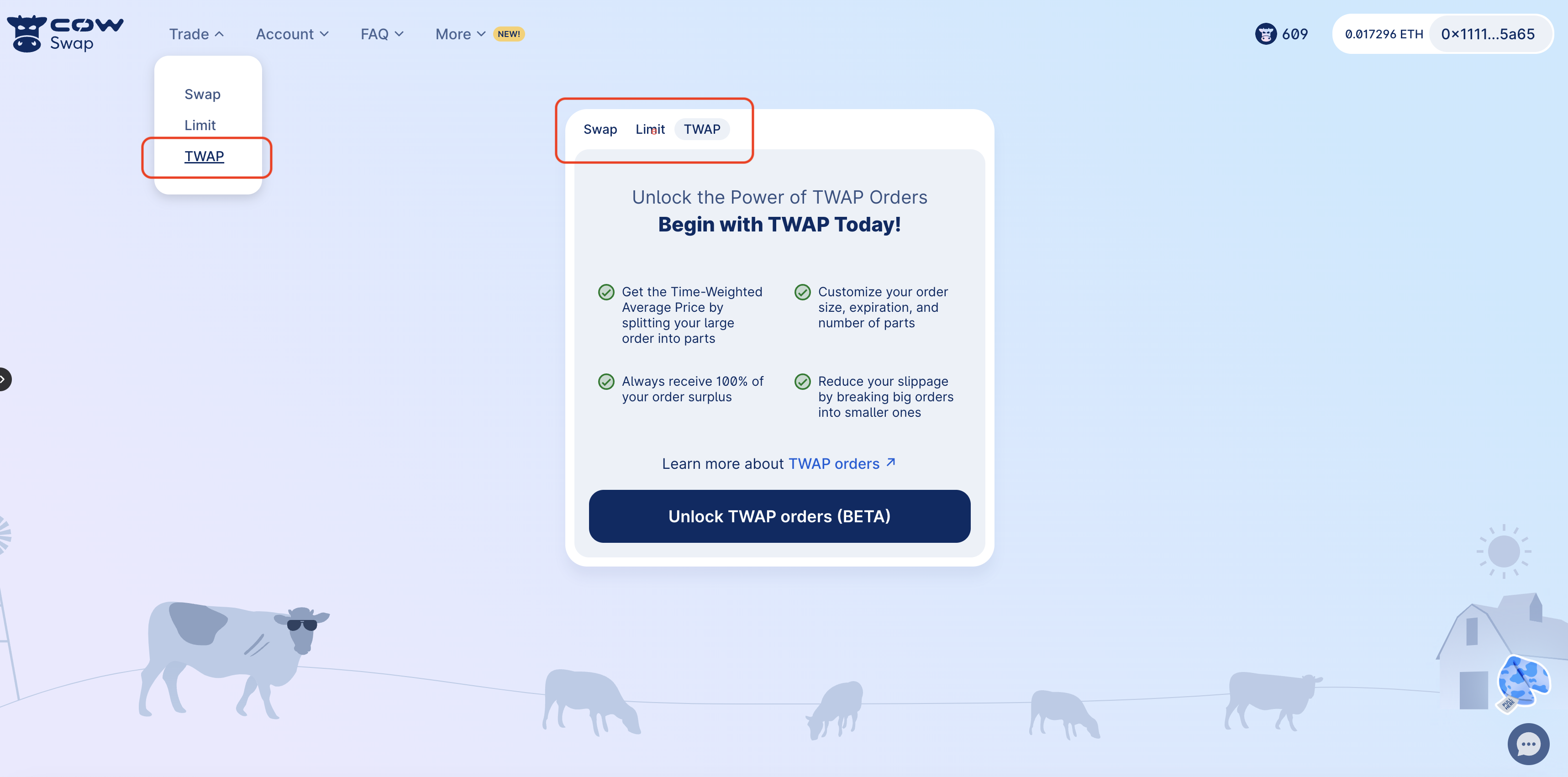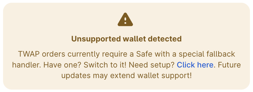 If your wallet is unsupported, upgrade to a Safe with the special fallback handler required for TWAP orders. Learn all about the new Safe fallback handler and its relevance to Safe in this overview. Naturally, the upgrade process has undergone extensive auditing for increased peace of mind.