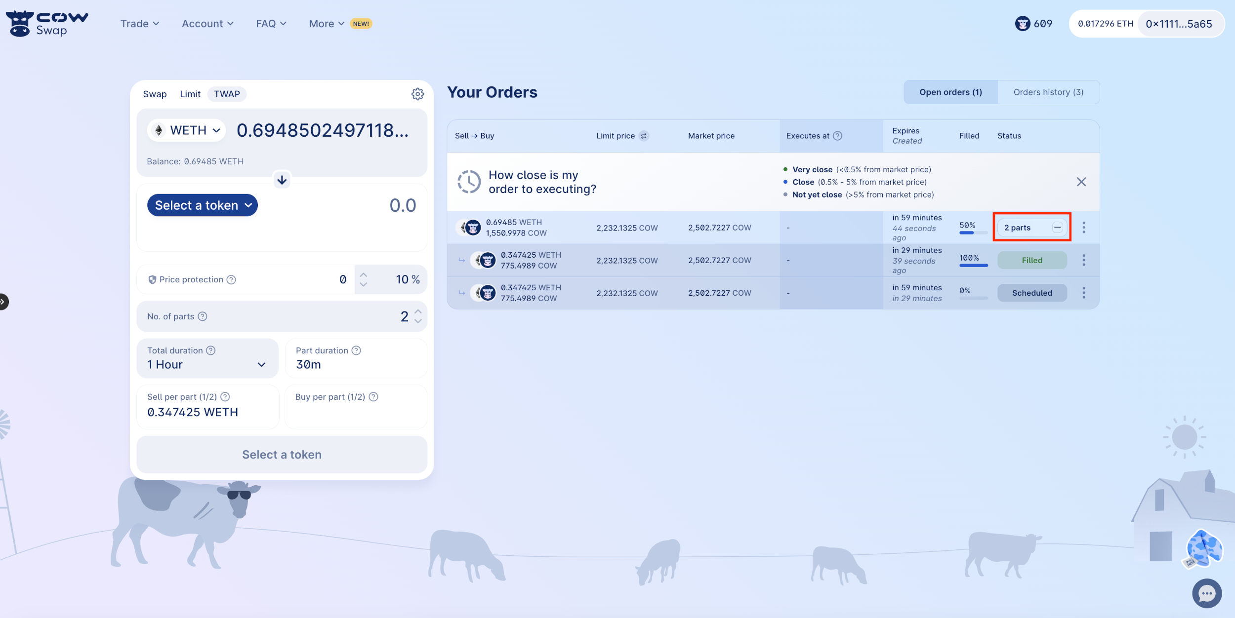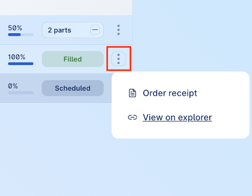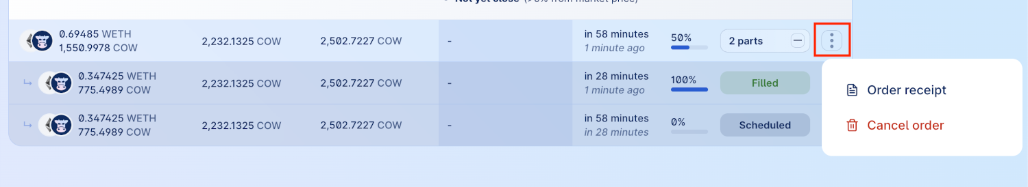 Each individual TWAP part also have a three-dot menu with actions pertaining to that individual order.